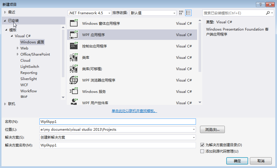 打开Visual Studio 2013,在菜单上点击文件—>新建—>项目—>WPF应用程序。在弹出界面的“名称”对应的文本框中输入“WpfApp1”,然后点击“确定”按钮。如下图。