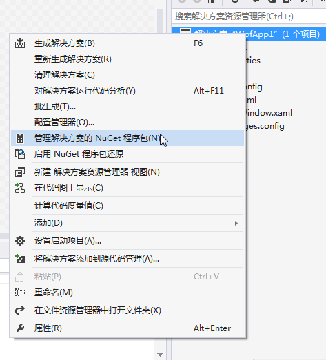 1) 使用NuGet下载最新版的Entity Framework 6.1。在解决方案资源管理器中——>在项目WpfApp1上鼠标右键单击——>弹出一个菜单,选中“管理解决方案的NuGet程序包”,打开NuGet程序包管理界面。如下图。