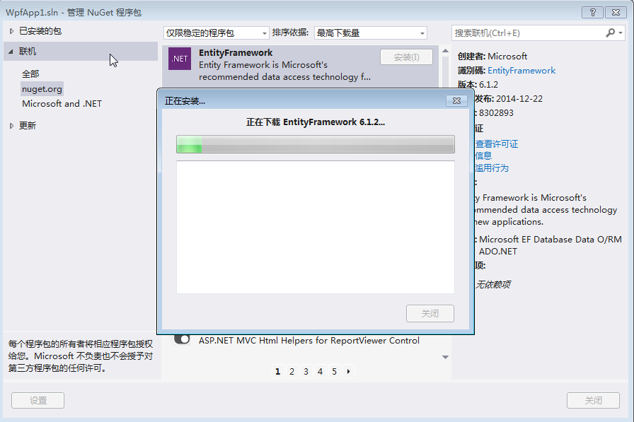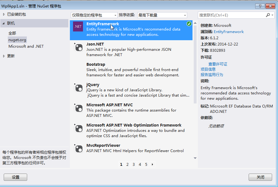 2) 在NuGet程序包管理界面中搜索 Entity,找到最新版本Entity Framework,点击安装。如下图。