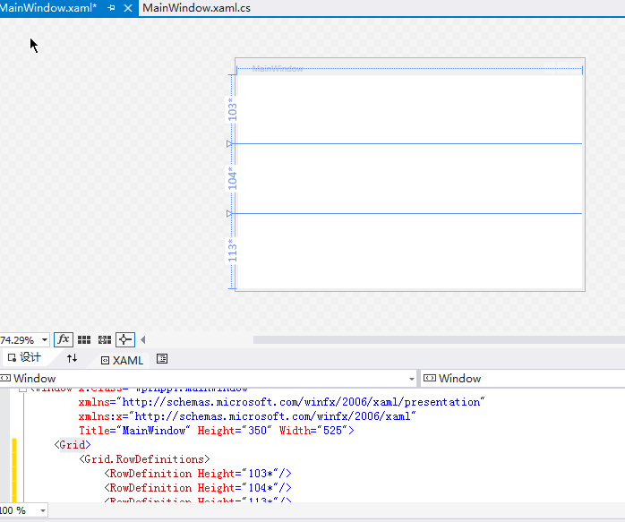 3) 我们先将窗体随意的分成三行,以后在XAML代码中再进行具体的调整。在添加完分割线之后,看一下下方的XAML代码区域,每个分割线都做为一行RowDefinition。如下图。