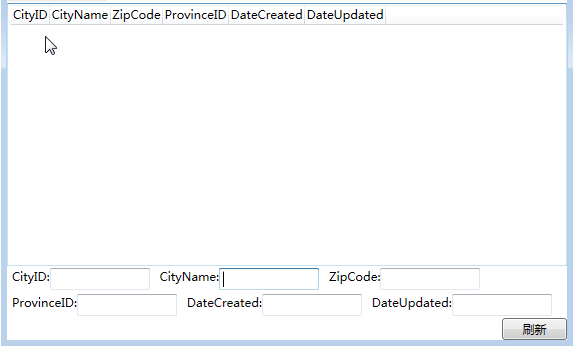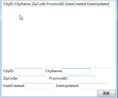写完了上面的代码之后,按F5,程序运行了起来,点“刷新”按钮却没有任何数据显示。这是由于后台数据与前面界面没有进行“绑定”,所以无法显示数据,接下来跟着我做。