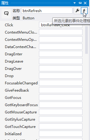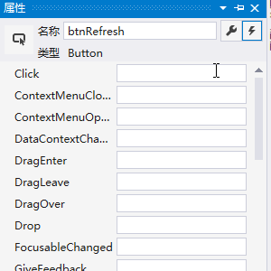 2) 在“属性”窗口中点击右上角的闪电图标按钮,会出现事件窗口。在Click事件的文本框中进行双击,就会把按钮的Click事件添加到后台代码中。如下图。