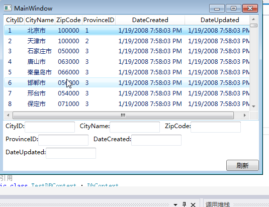 在后台用Entity Framework 6.1的Code First方式获取数据库中的数据。同时,在“刷新”按钮的方法中进行数据绑定。操作步骤如下: