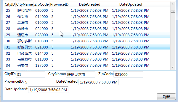 6) 在Visual Studio 2013中按F5运行WPF程序,在程序运行起来之后,鼠标左键点击“刷新”按钮。在出现数据之后,使用鼠标左键点击ListView中的记录,你会发现文本框与ListView实现了联动。如下图。