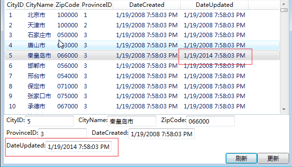 4) 选中一条记录,然后进行修改,更改之后,点击“更新”按钮。就可以把数据保存到数据库了。如下图。