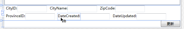 <WrapPanel Grid.Row="2" Orientation="Horizontal" DataContext="{Binding ElementName=listView1,Path=SelectedItem}"> <StackPanel Orientation="Horizontal" Margin="5,2,5,2"> <TextBlock Name="textBlock_CityID" Text="CityID:" /> <TextBox Name="textBox_CityID" MinWidth="100" Text="{Binding CityID}" /> </StackPanel> <StackPanel Orientation="Horizontal" Margin="5,2,5,2"> <TextBlock Name="textBlock_CityName" Text="CityName:" /> <TextBox Name="textBox_CityName" MinWidth="100" Text="{Binding CityName}" /> </StackPanel> <StackPanel Orientation="Horizontal" Margin="5,2,5,2"> <TextBlock Name="textBlock_ZipCode" Text="ZipCode:" /> <TextBox Name="textBox_ZipCode" MinWidth="100" Text="{Binding ZipCode}" /> </StackPanel> <StackPanel Orientation="Horizontal" Margin="5,2,5,2"> <TextBlock Name="textBlock_ProvinceID" Text="ProvinceID:" /> <TextBox Name="textBox_ProvinceID" MinWidth="100" Text="{Binding ProvinceID}" /> </StackPanel> <StackPanel Orientation="Horizontal" Margin="5,2,5,2"> <TextBlock Name="textBlock_DateCreated" Text="DateCreated:" /> <TextBox Name="textBox_DateCreated" MinWidth="100" Text="{Binding DateCreated}" /> </StackPanel> <StackPanel Orientation="Horizontal" Margin="5,2,5,2"> <TextBlock Name="textBlock_DateUpdated" Text="DateUpdated:" /> <TextBox Name="textBox_DateUpdated" MinWidth="100" Text="{Binding DateUpdated}" /> </StackPanel> </WrapPanel>